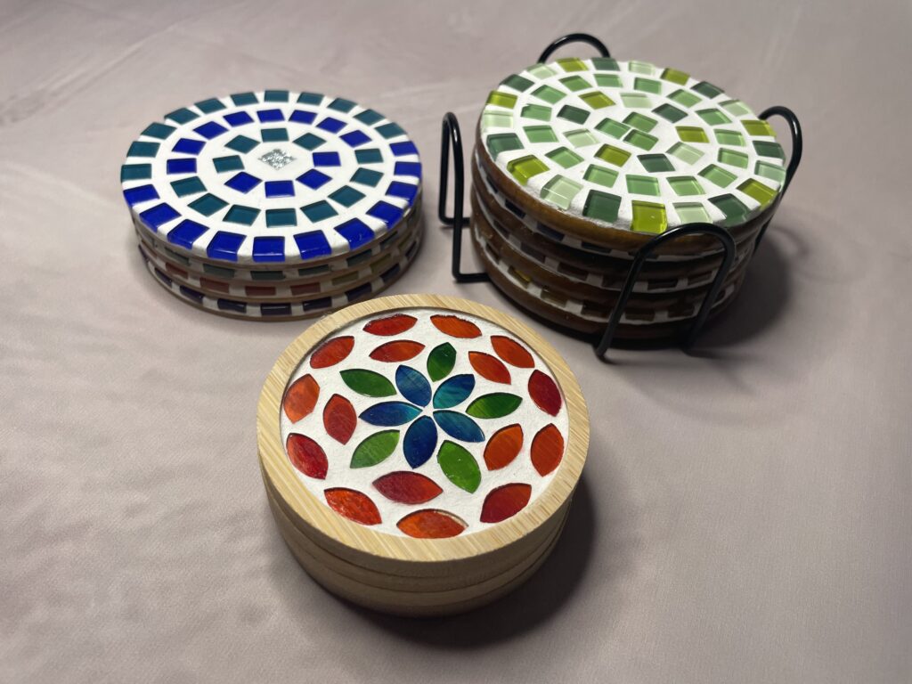 Handgemaakte onderzetters mozaïek| Happy CirclePrijsklasse: € 22,95 tot € 27,95 -