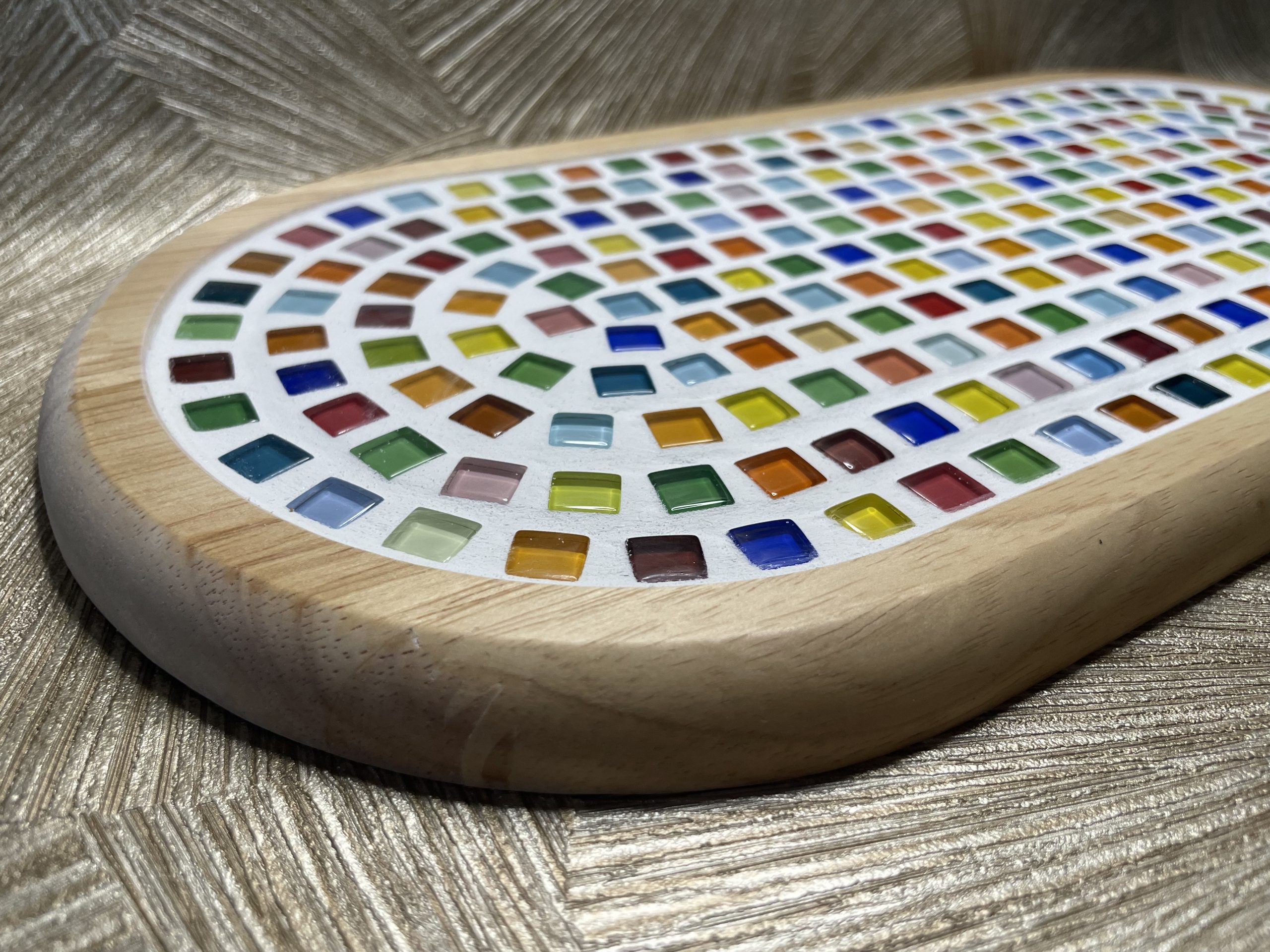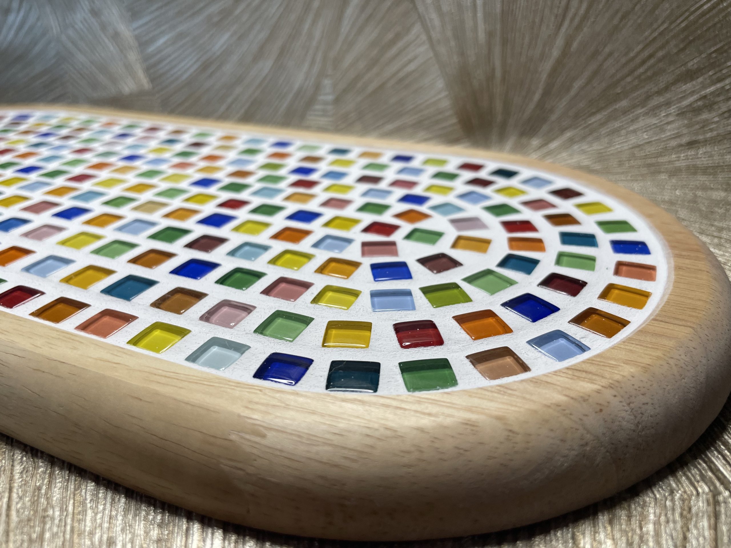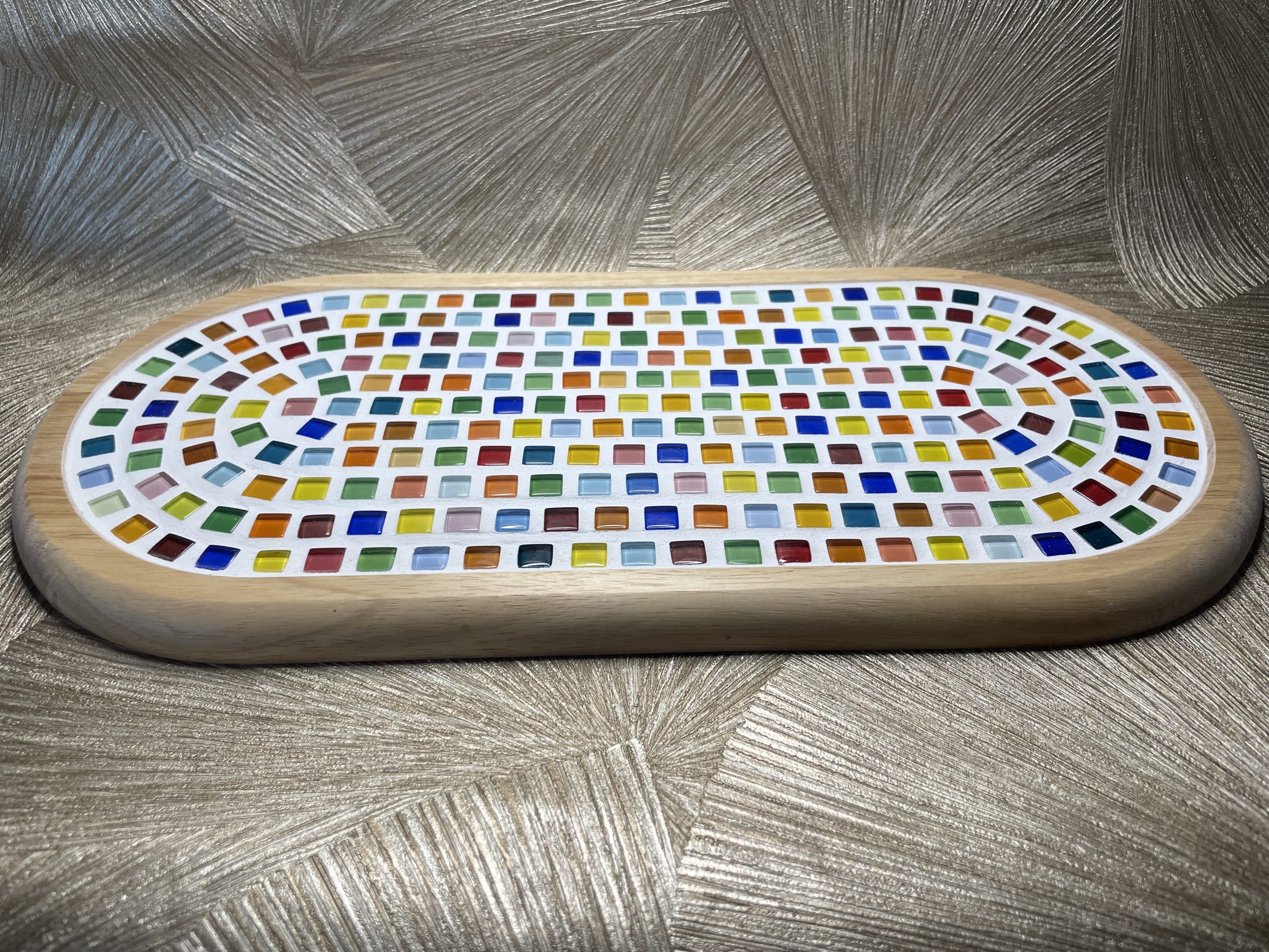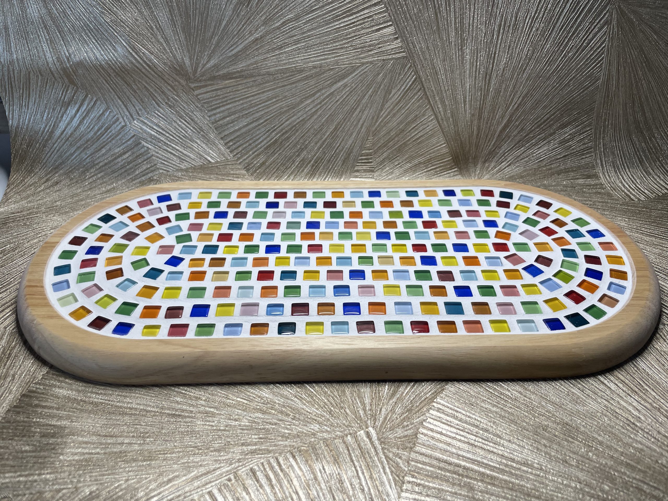 Dit mozaïek plateau is met de hand gemaakt en daardoor stuk voor stuk uniek. De zorgvuldig geplaatste mozaïek steentjes geven elke plank een karaktervolle en luxe uitstraling, ideaal om hapjes, kazen of tapas op te serveren.
