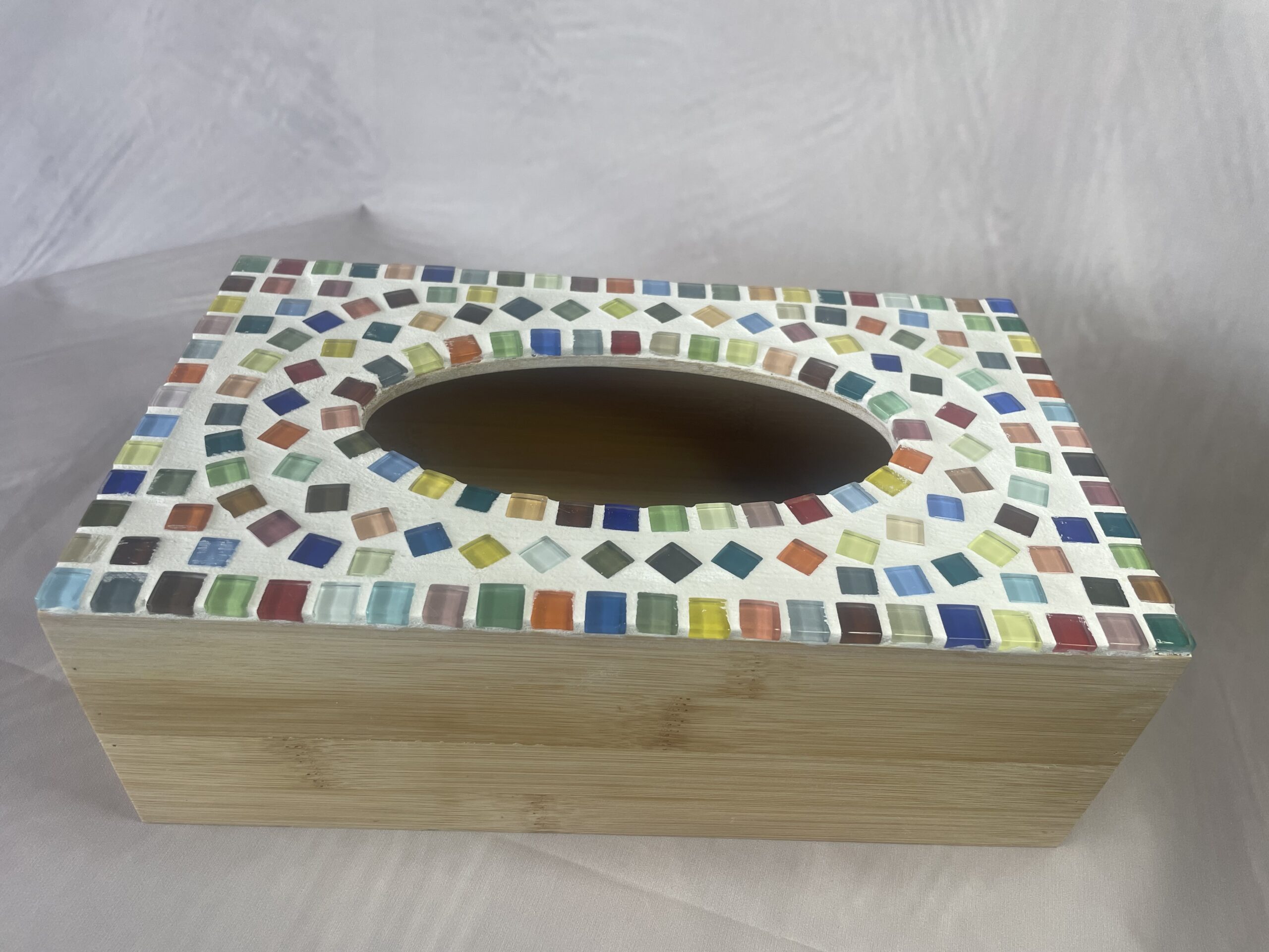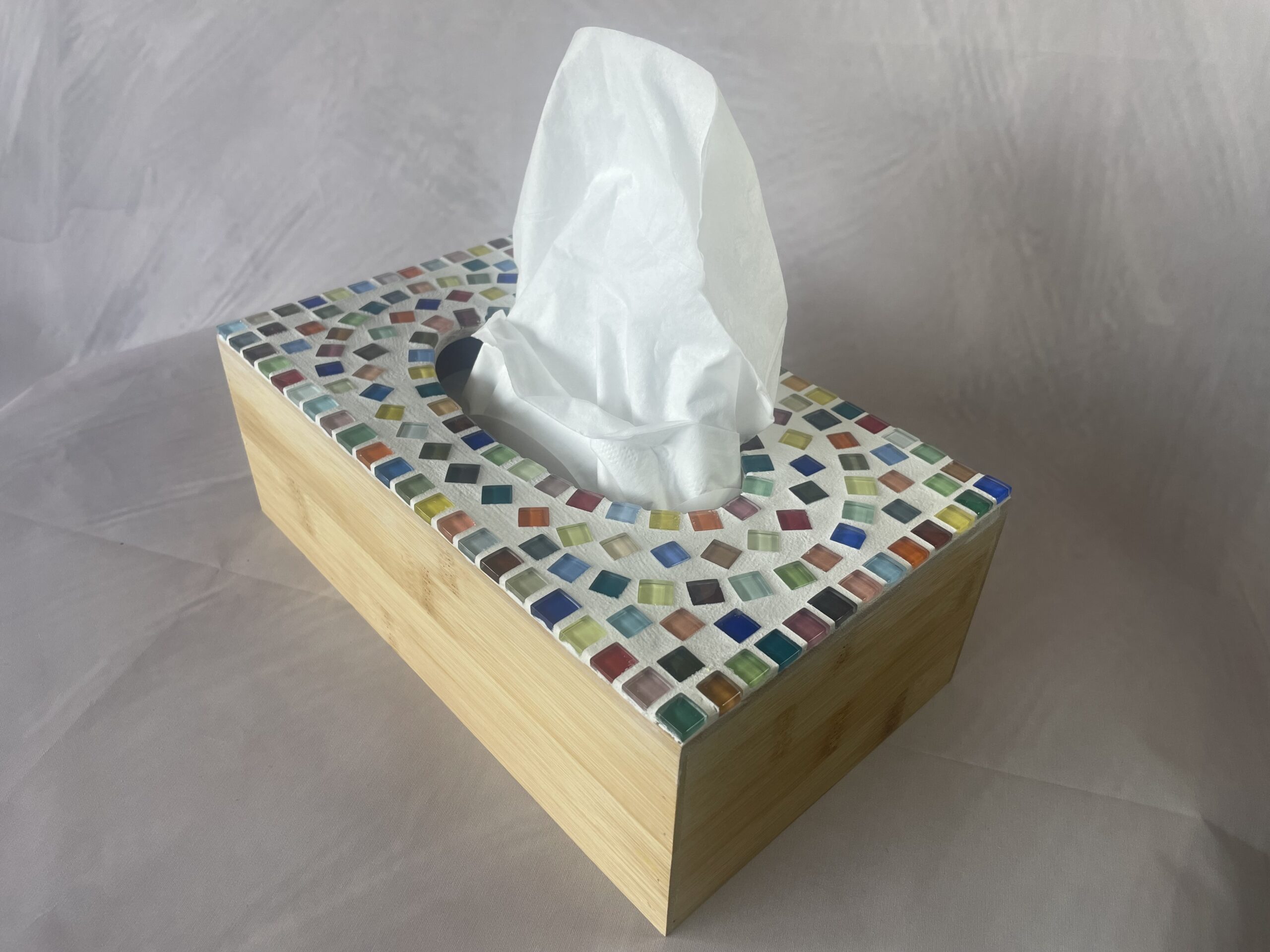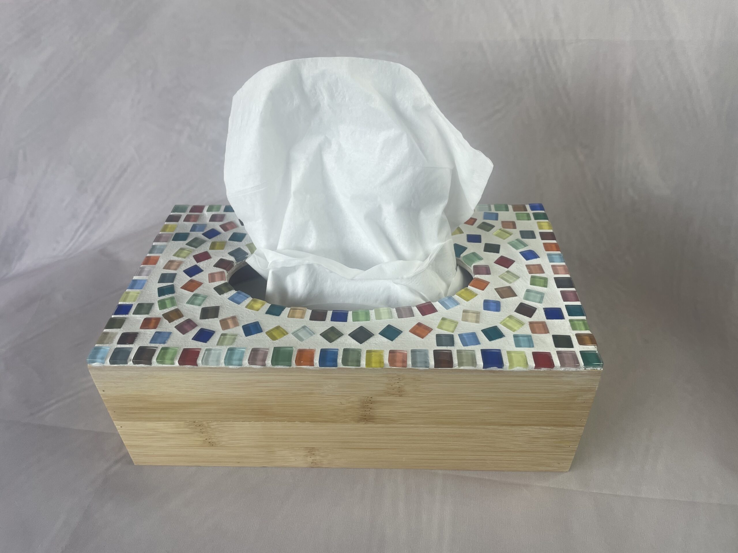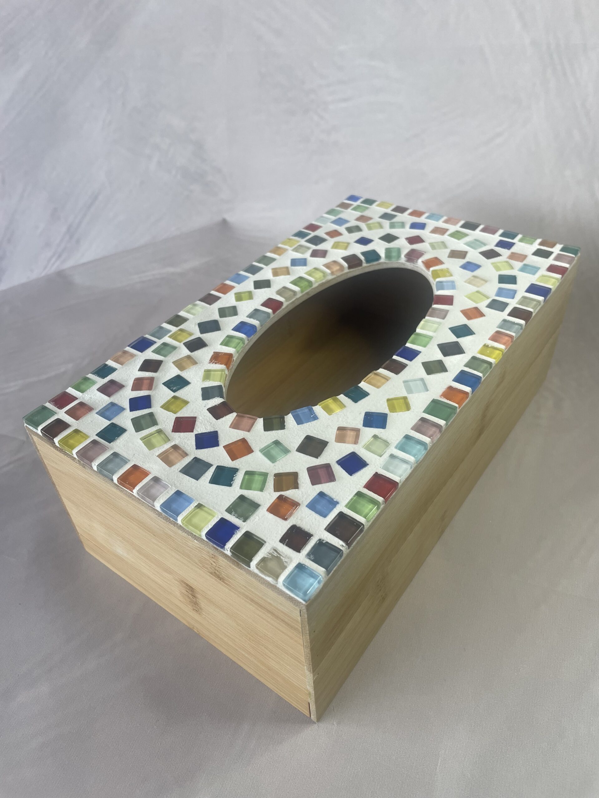 Geef een alledaags item een bijzonder plekje. Deze handgemaakte tissuehouder combineert natuurlijke materialen met speelse kleuren. De basis is gemaakt van warm bamboehout en afgewerkt met een zorgvuldig gelegd mozaïek van gekleurde glassteentjes. Elk steentje vangt het licht net even anders, waardoor de houder steeds blijft verrassen.