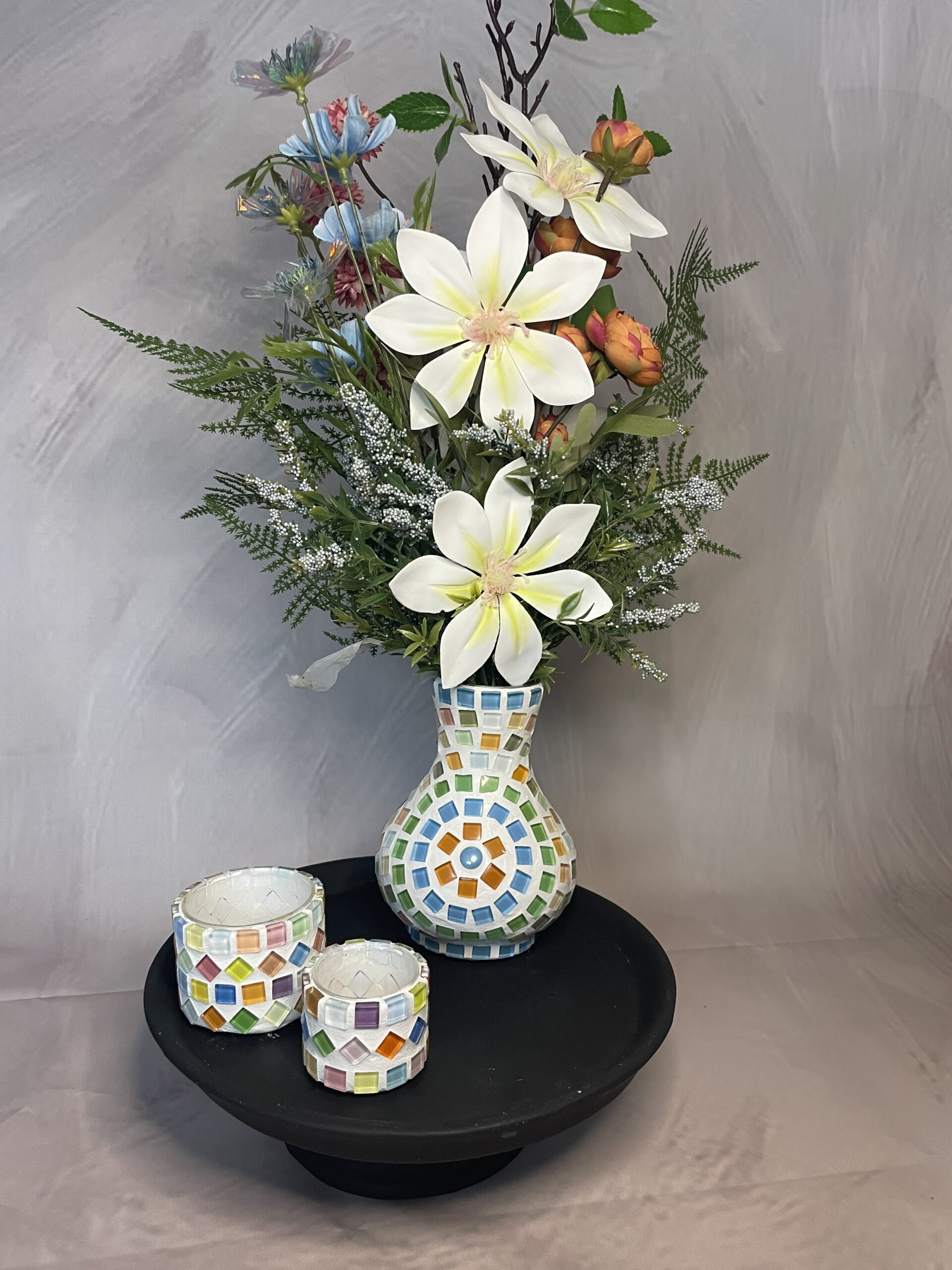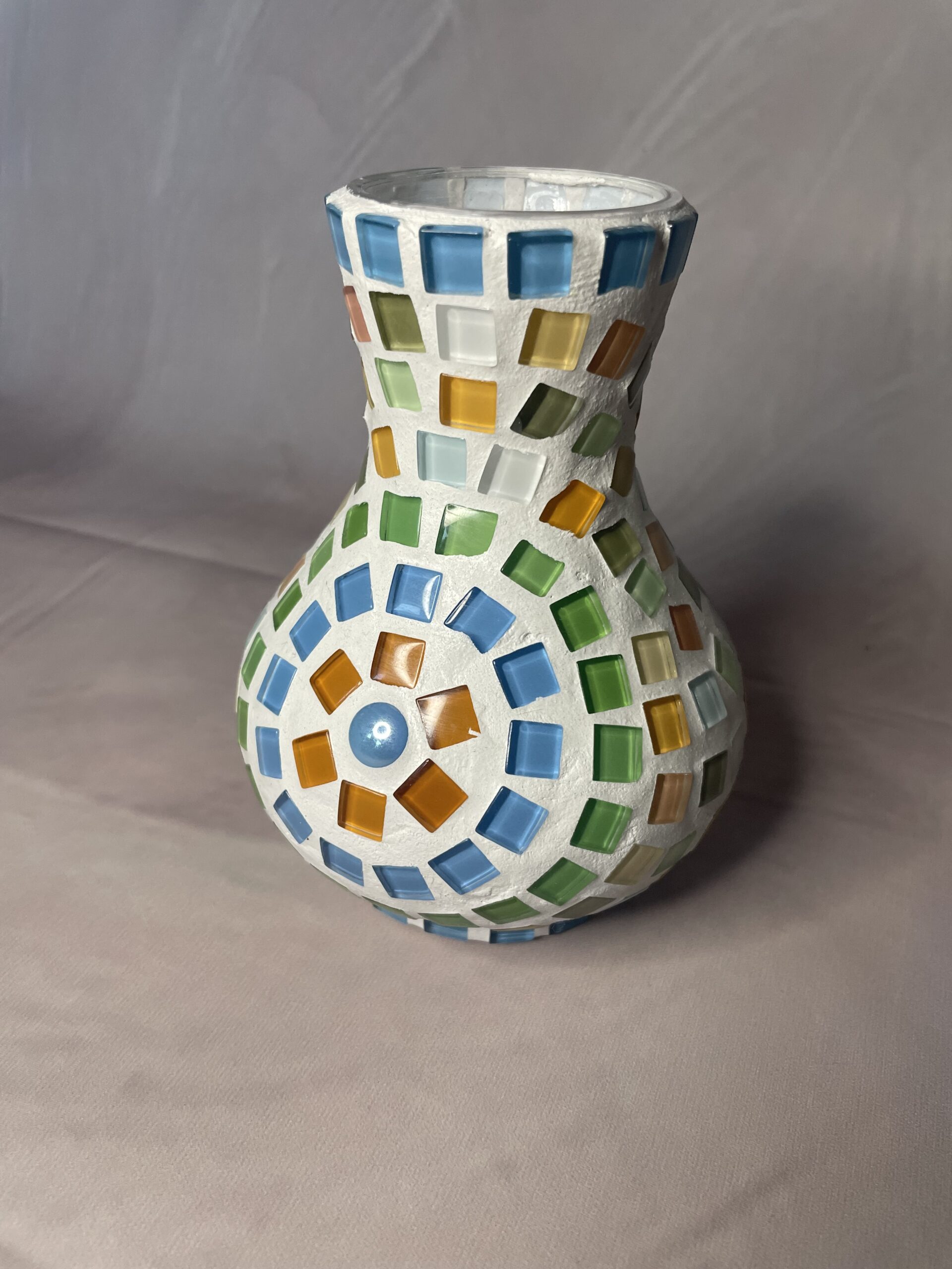 Deze unieke vaas van luno-handmade is een echte blikvanger in elk interieur. De elegante, organische vorm wordt versterkt door een speels mozaïek van handgeplaatste glassteentjes in zachte én levendige kleuren. Elke kleur vangt het licht op een andere manier, waardoor de vaas vanuit elke hoek blijft verrassen.