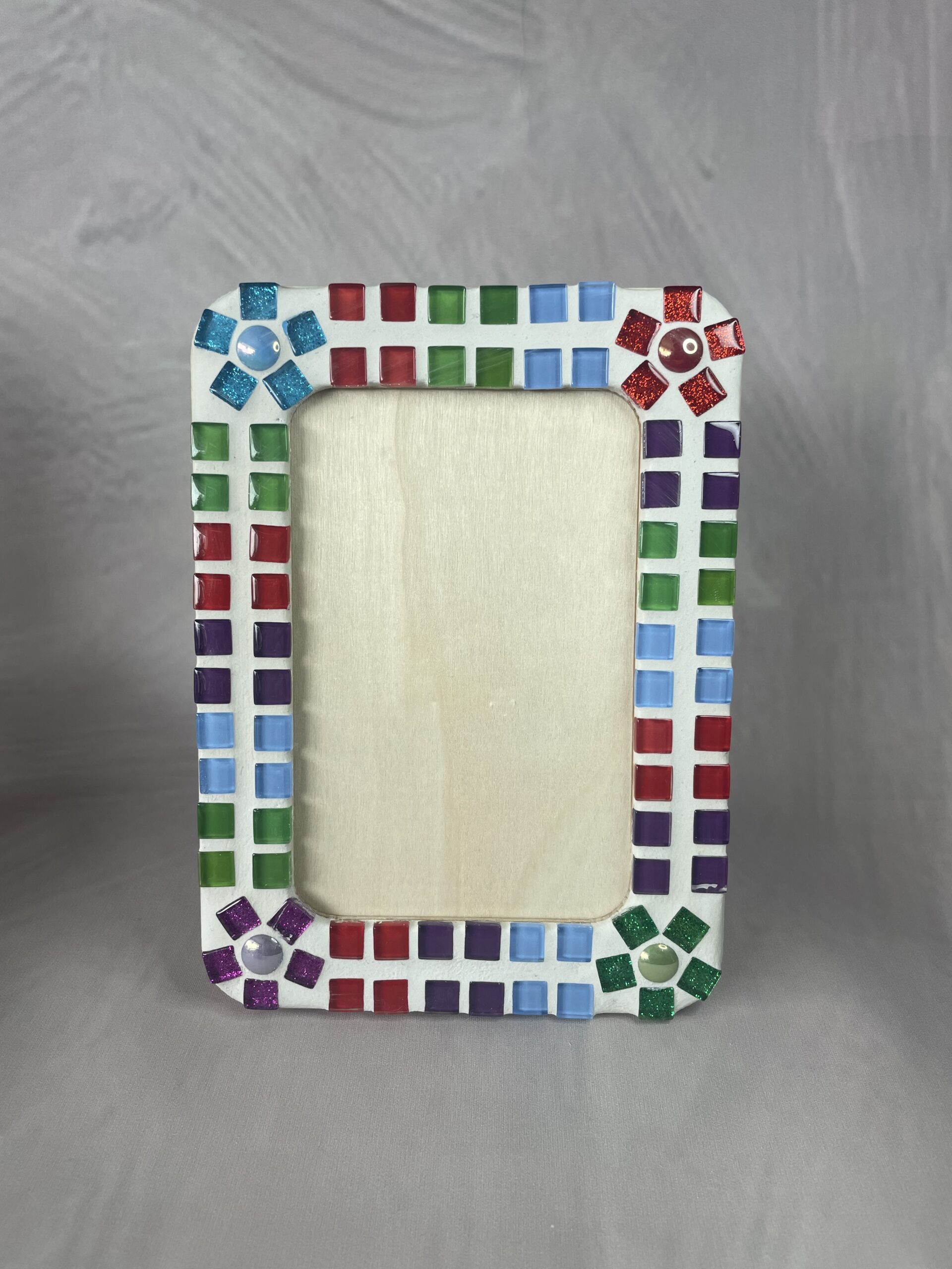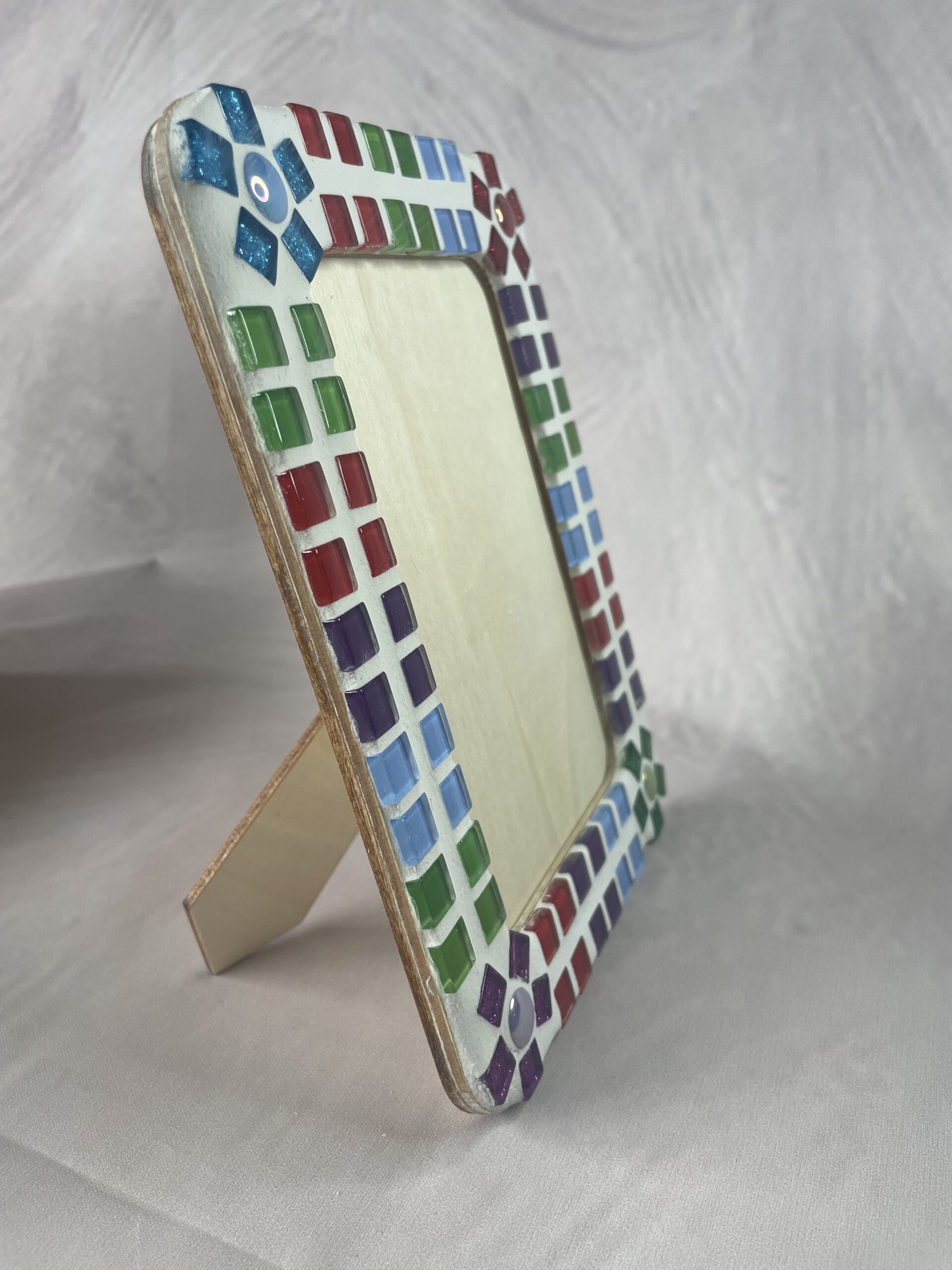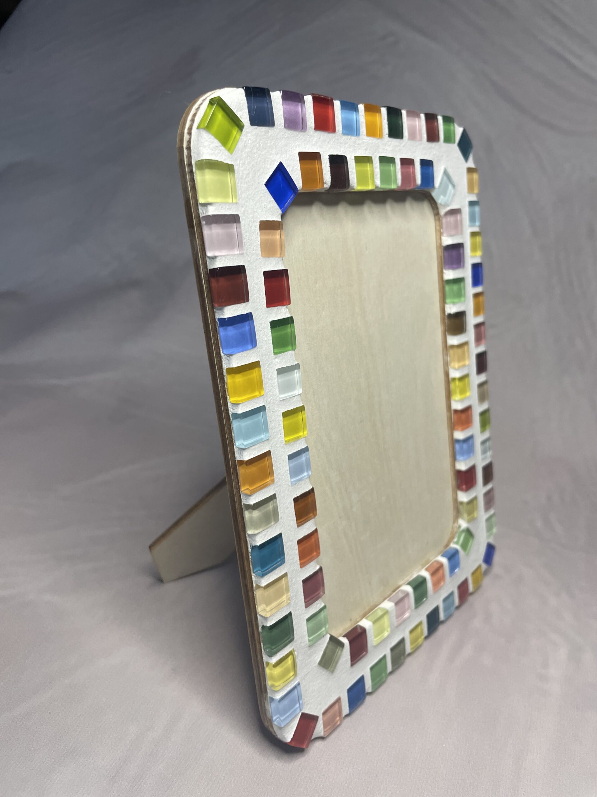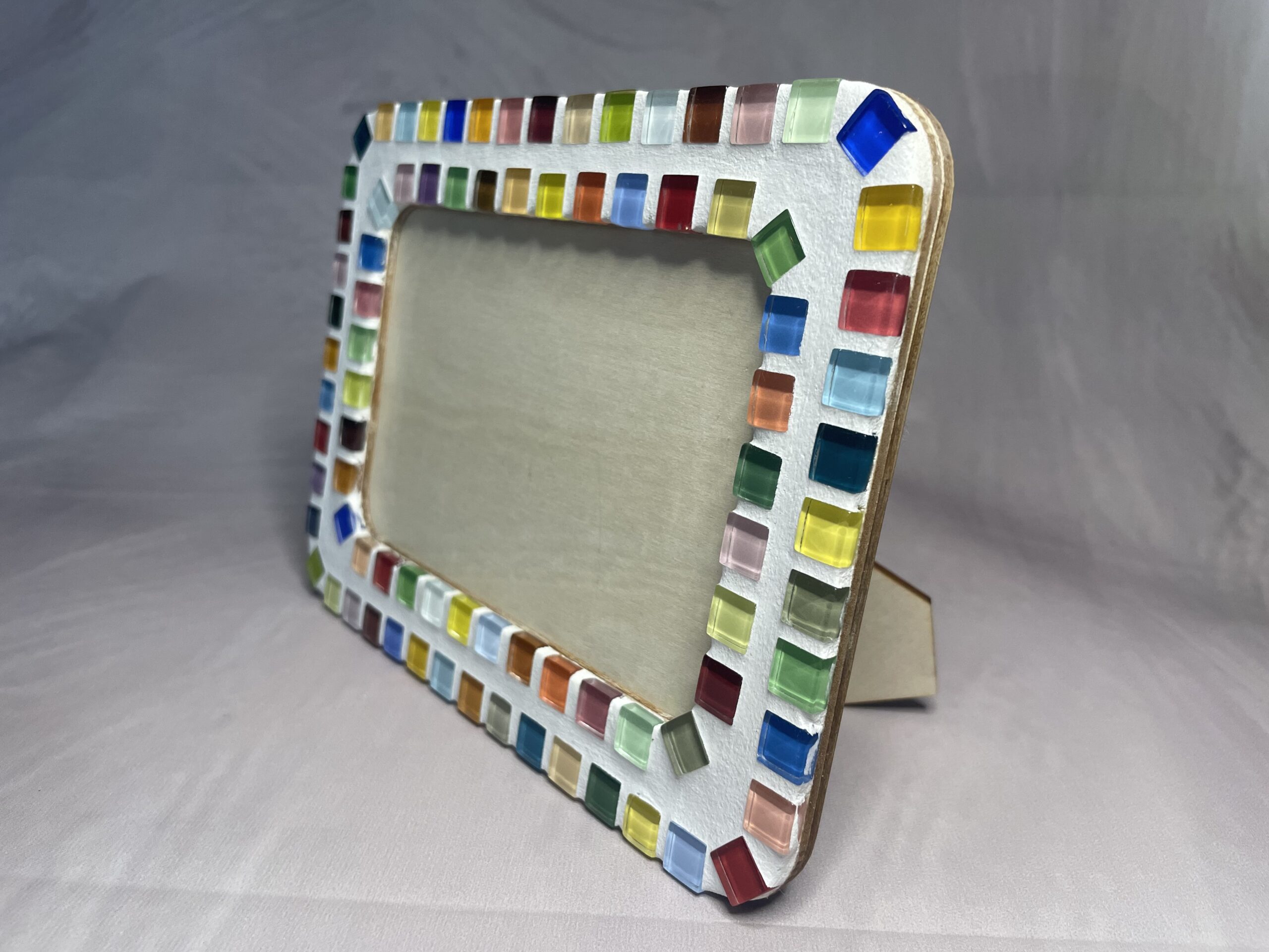 Breng kleur en vrolijkheid in je interieur met deze handgemaakte confetti fotolijst. De rand is met zorg versierd met kleine, kleurrijke glassteentjes die samen een speels mozaïek vormen. Hierdoor krijgt elke foto een unieke en feestelijke omlijsting.