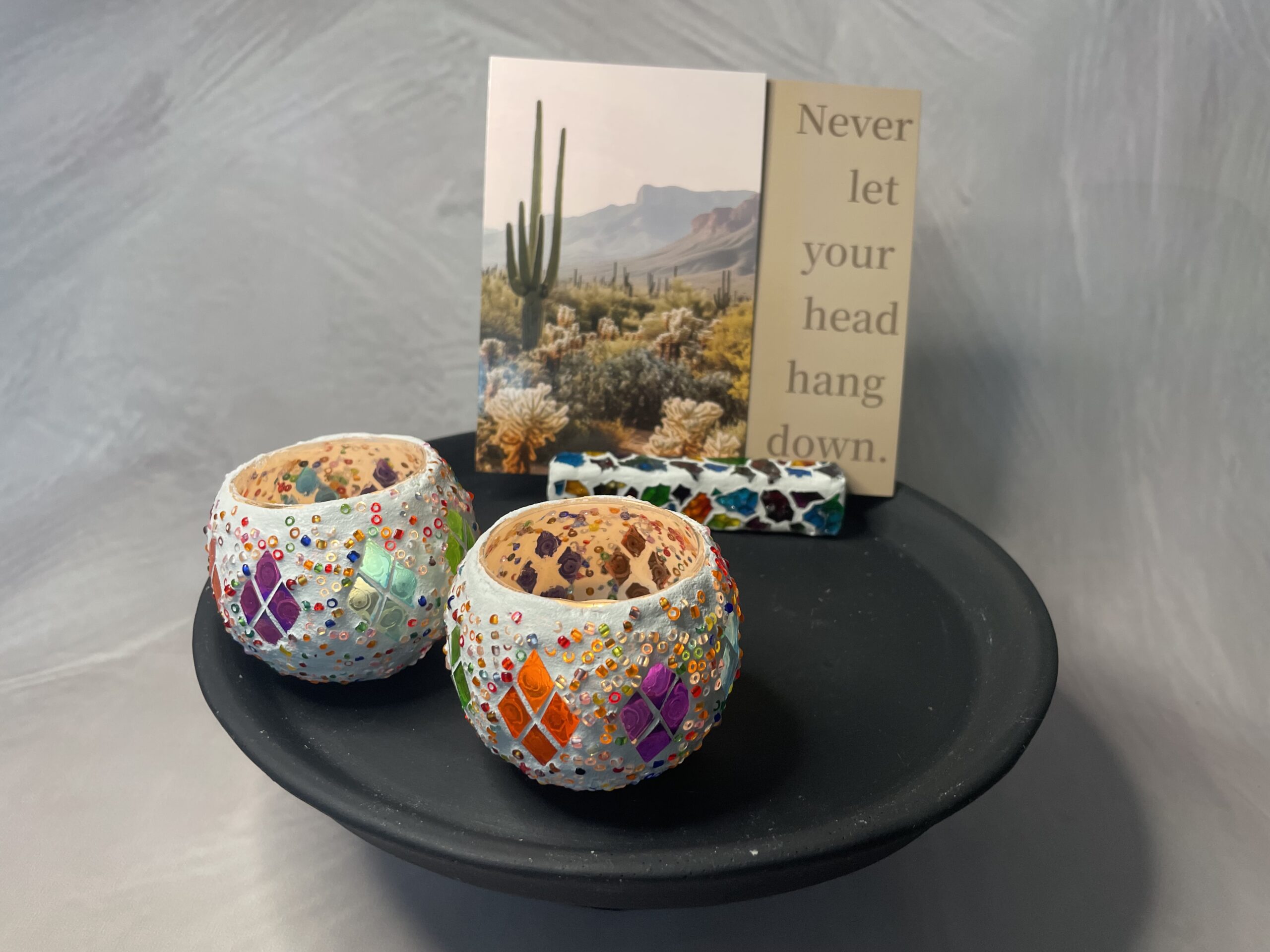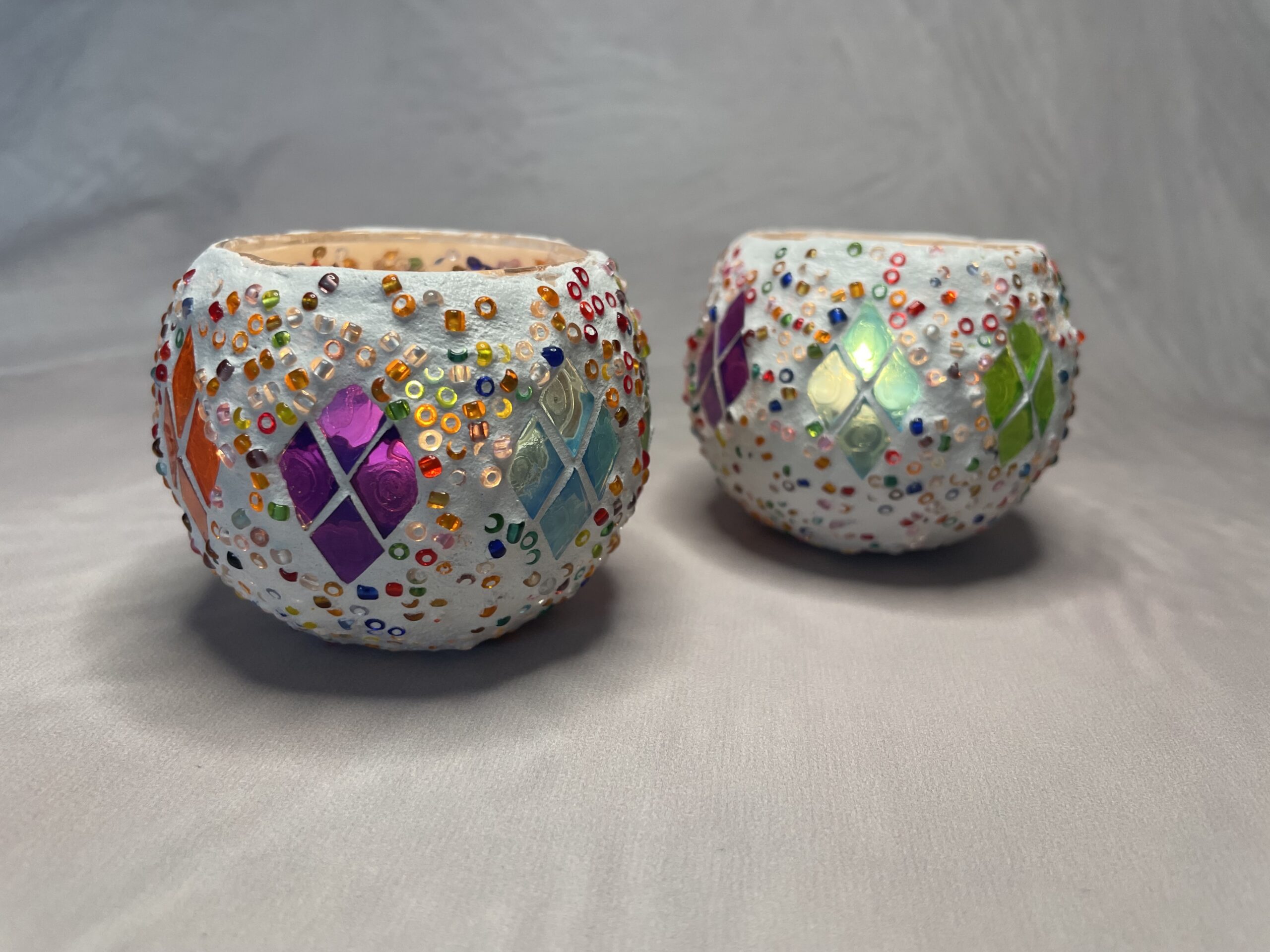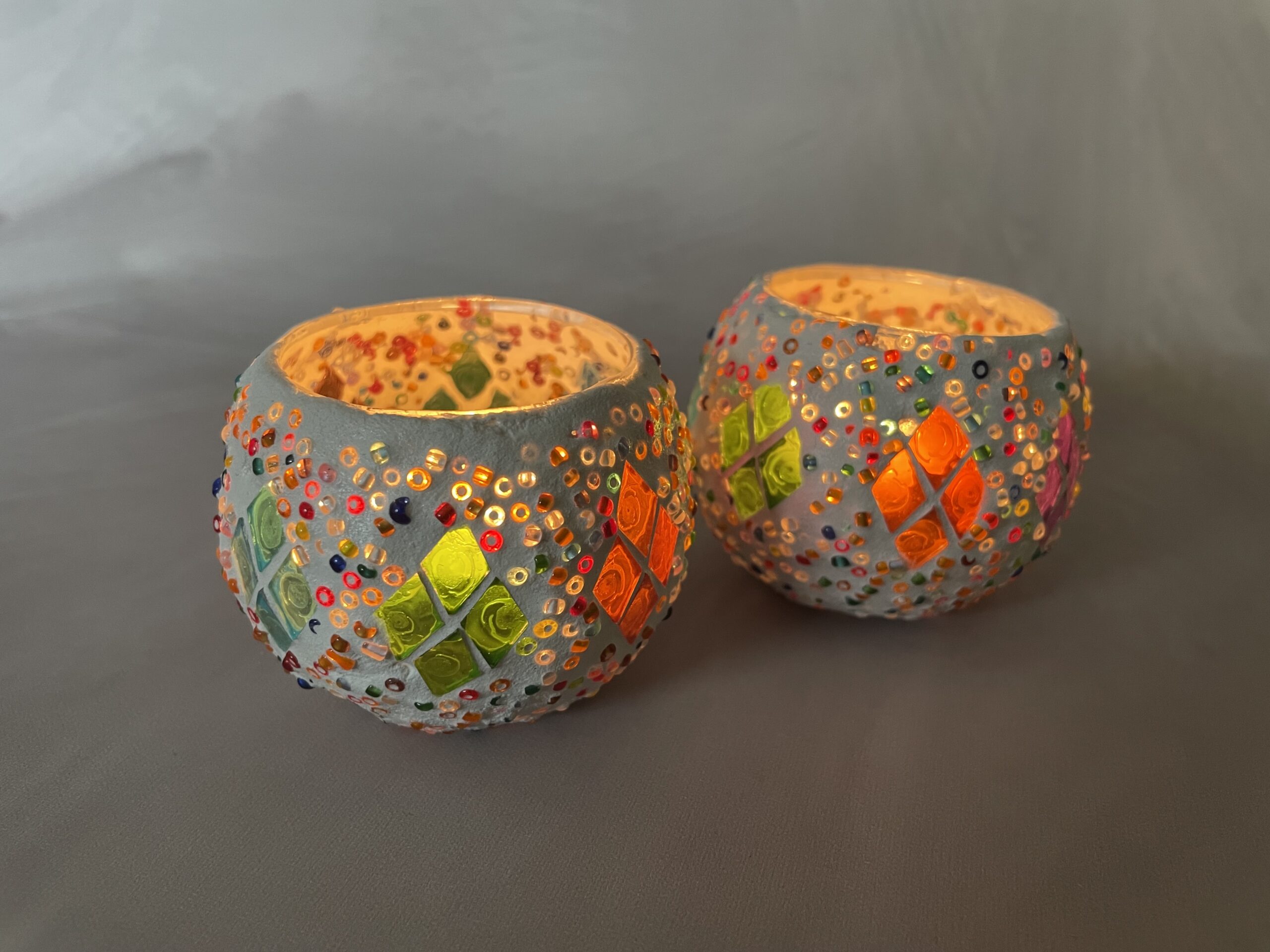 Het glasmozaïek is gelegd in een diamond patroon, waardoor het kaarslicht prachtig door de kleuren heen schijnt.